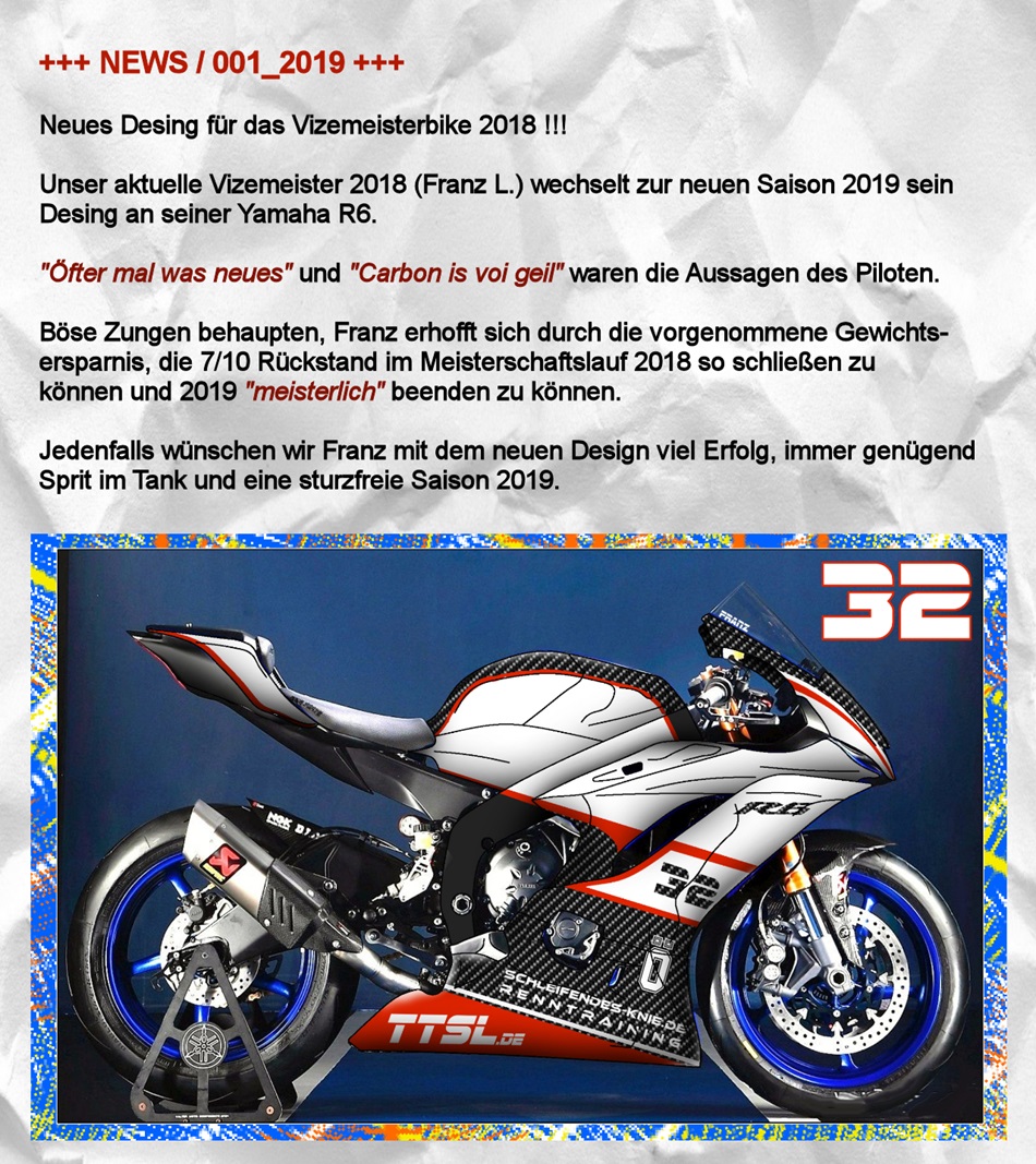 Markus K. konnte mit Franz L. (TTSL Rennsporttechnik) einen Sponsor gewinnen, der für die drei letztplatzierten des Rennens, jeweils zwei isotonische Getränke an Kasi´s Vitaminbar übernimmt (Schleiferevent Juli 2019 in Most).