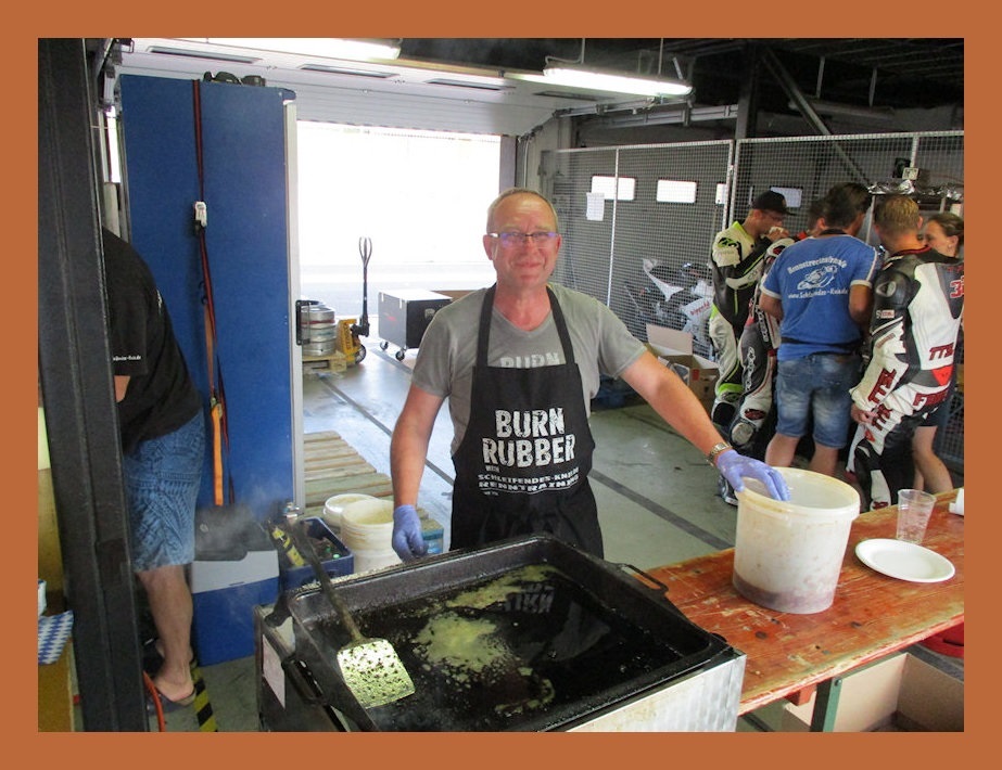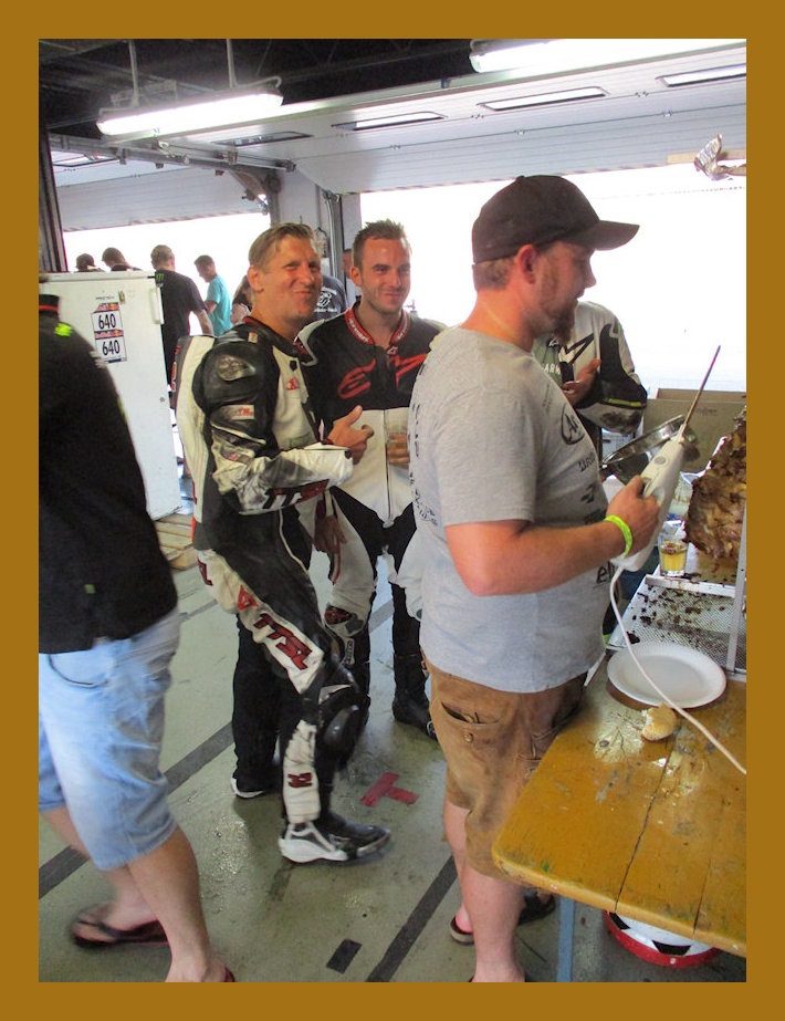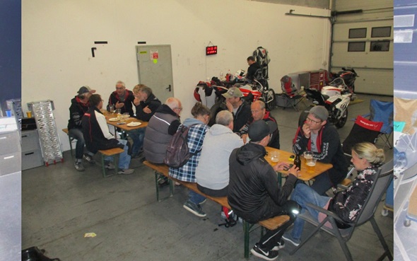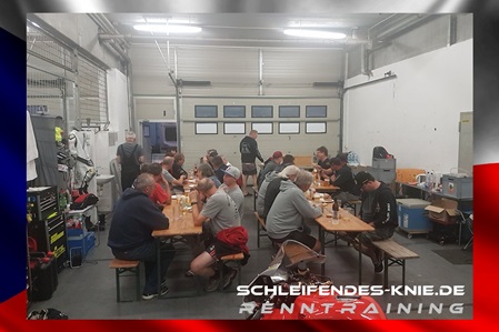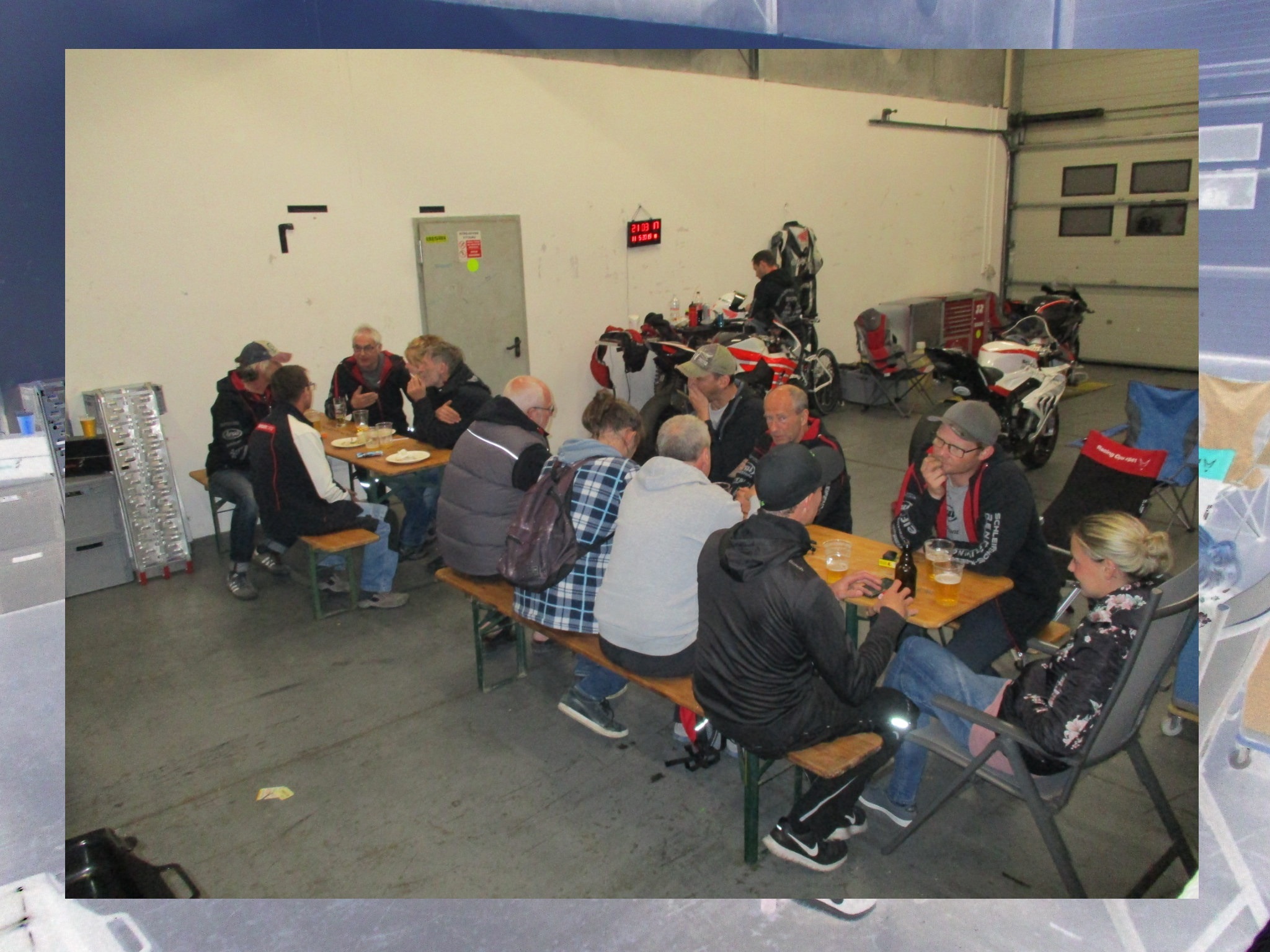 Nach drei weiteren Turns und einer zwischenzeitlichen Streckenbegehung, in der nochmals die Ideallinie erklärt und einige spezielle Kniffe besprochen wurde, konnten sich alle Teilnehmer in der Mittagspause im Bistro für die letzten beiden Turns am Nachmittag stärken…nom, nom, nom.