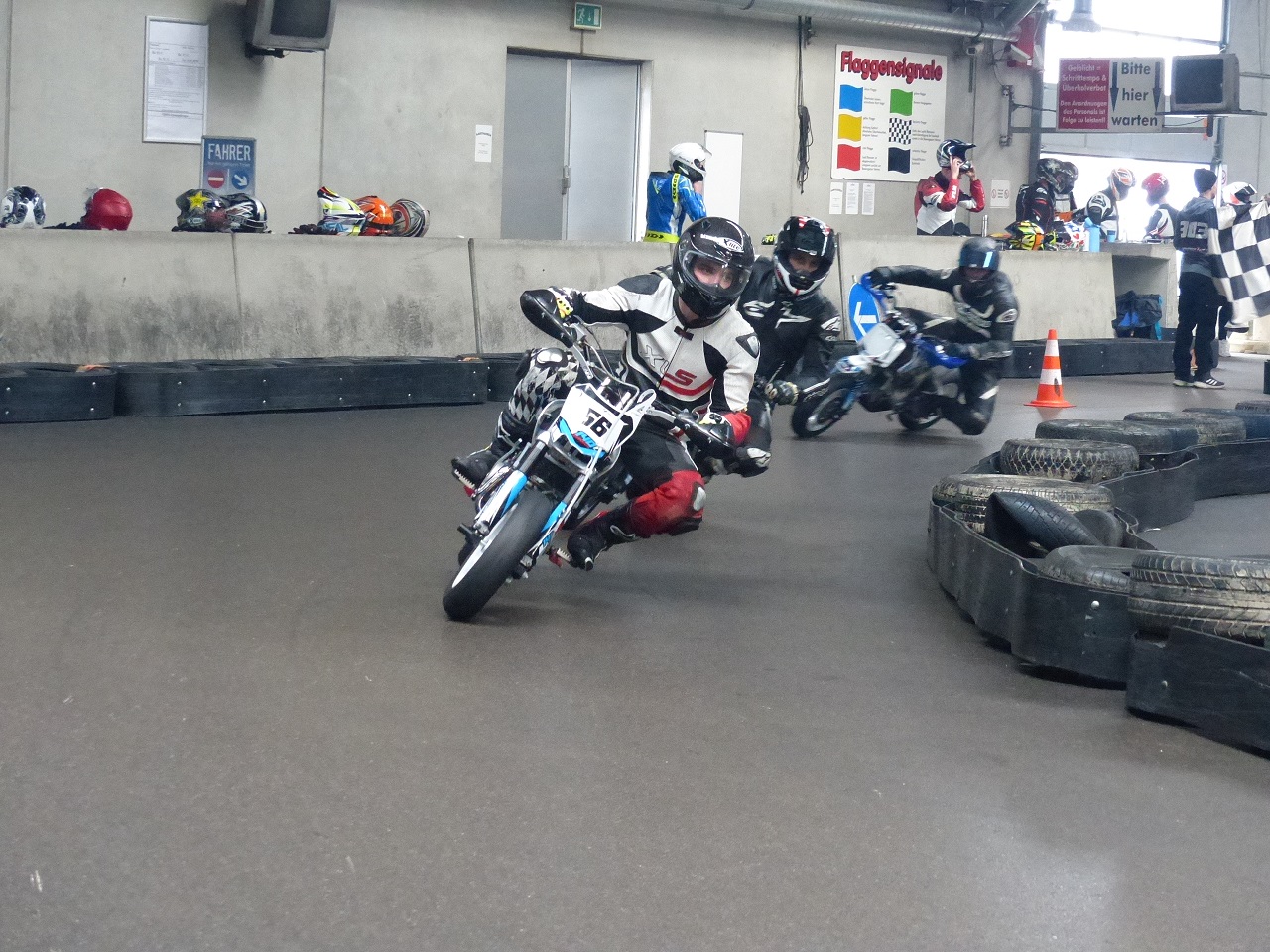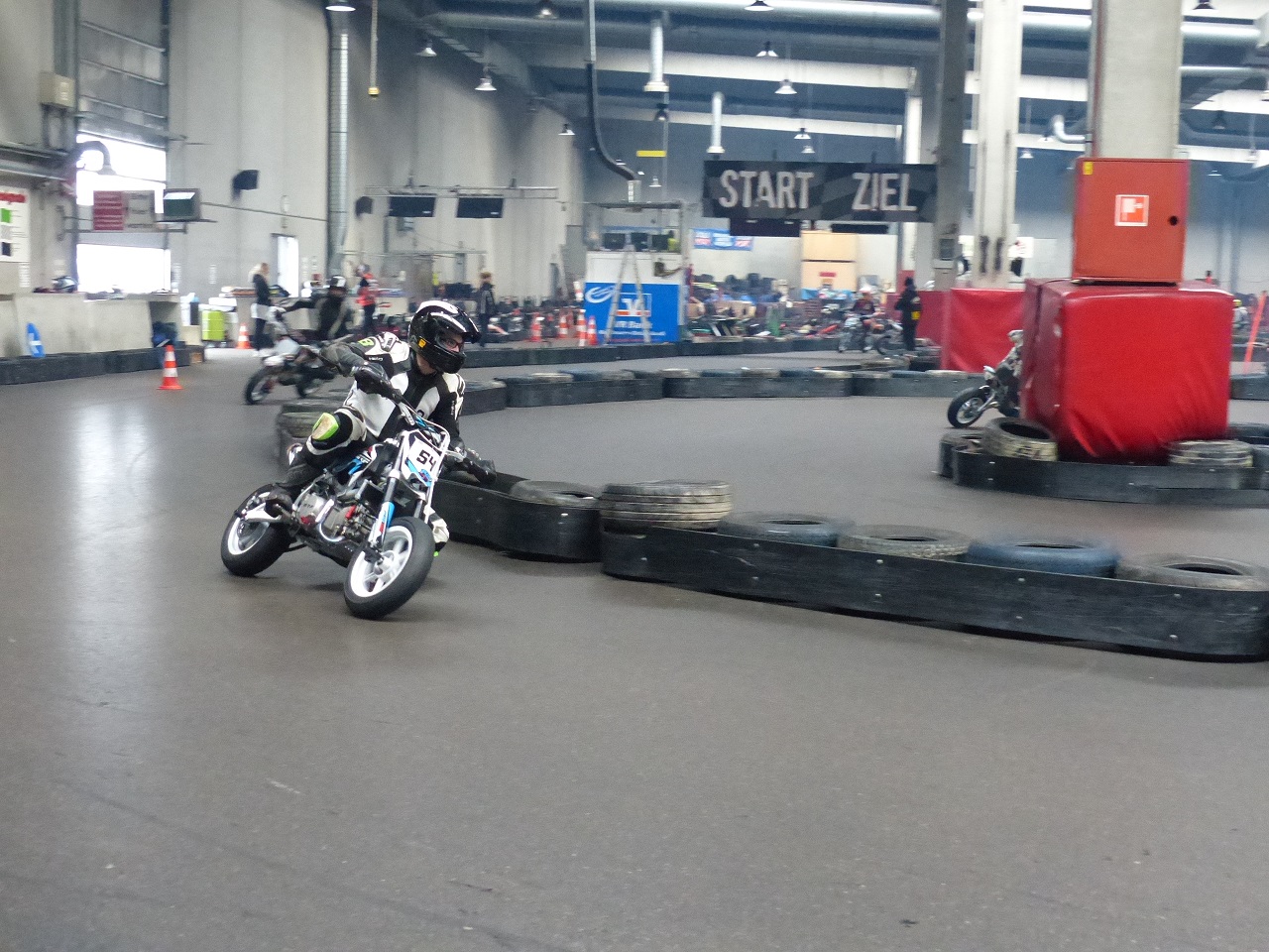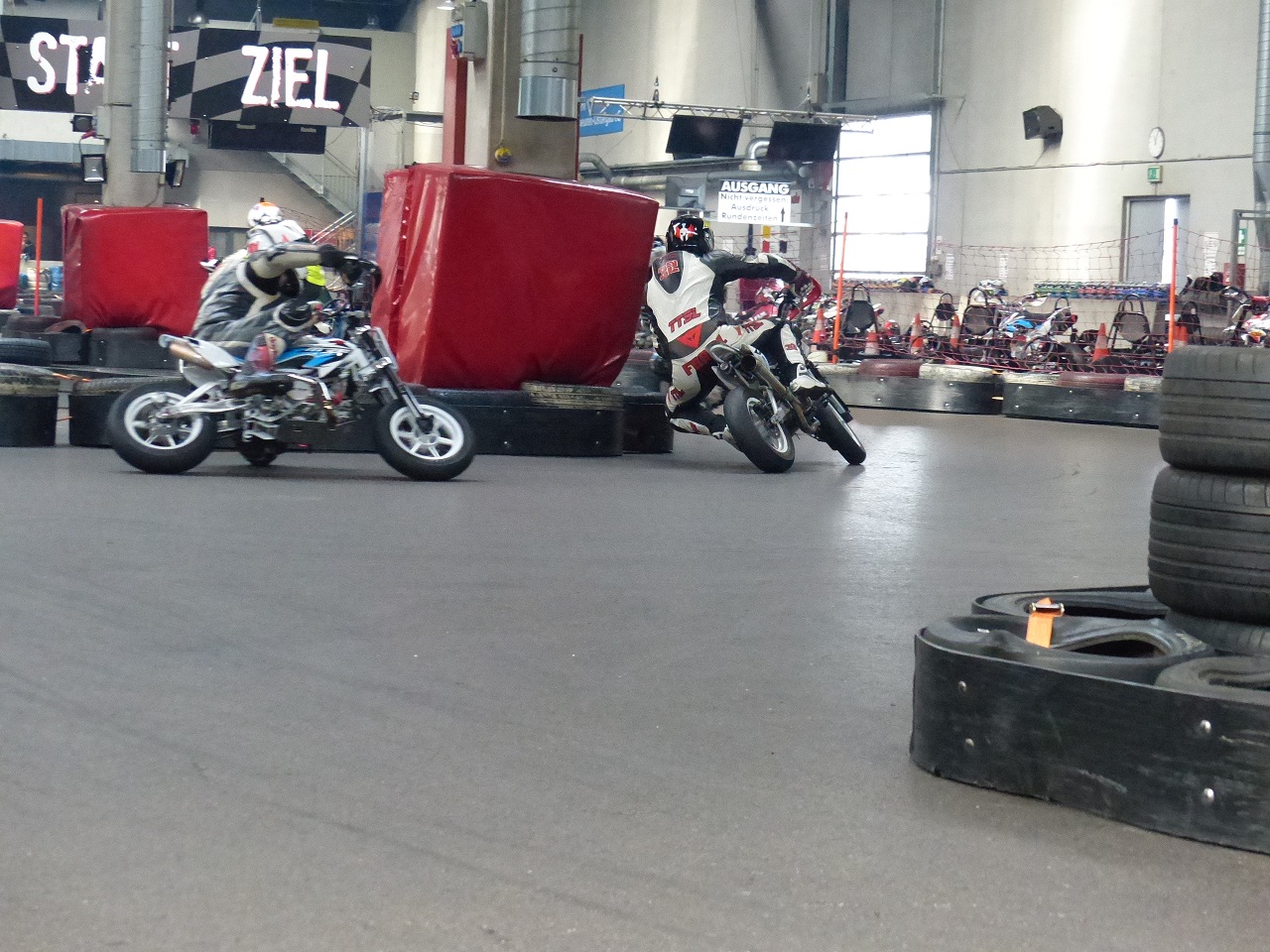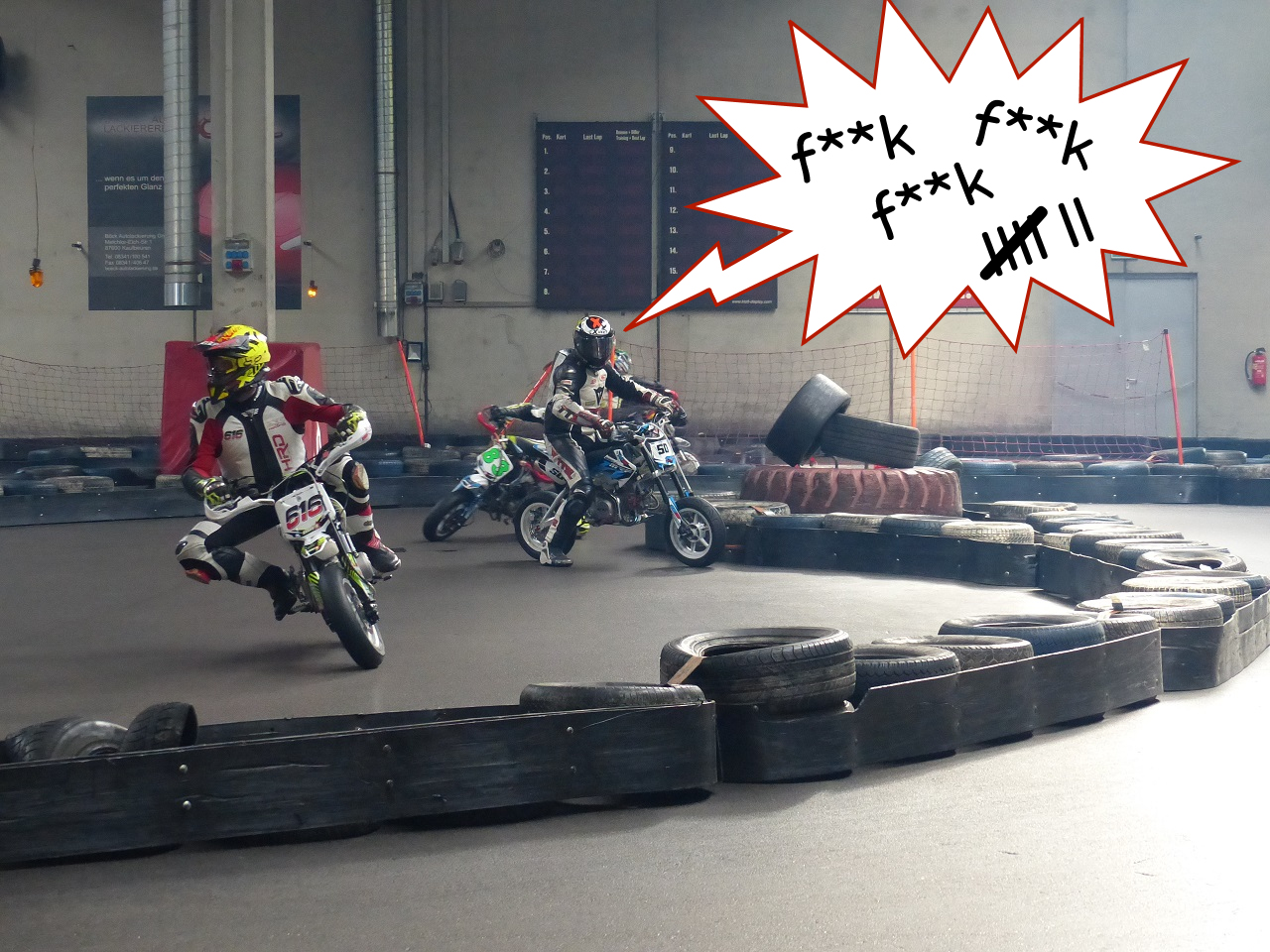 Das Rennen wurde stehend gestartet, wobei der ein oder andere wirklich stand oder nur sehr schwer in Schwung kam, aber 7-8 Pit-Bikes gemeinsam in die erste Kurve…ja doch...wie auf der Rennstrecke, nur bisschen kleiner. :D