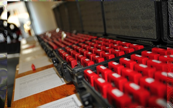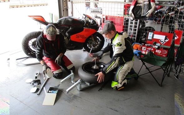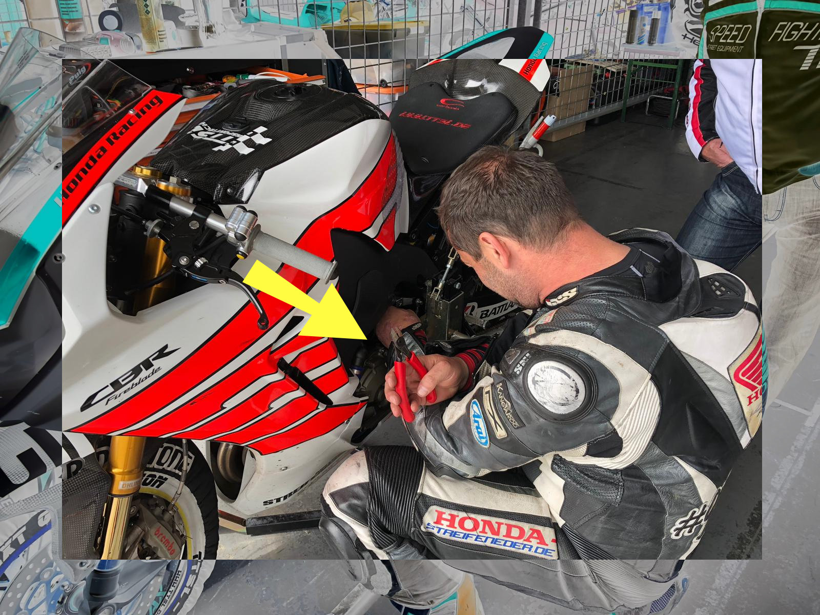 Samstags blieb es mit 12-13°C Lufttemperatur kühl, aber es konnten noch einige trockene Installations- und Einstellrunden gedreht werden, bevor es gegen 16.00 Uhr wieder anfing zu regnen. Nik nutzte die Zeit in der Box, um filigrane Justierungen an seinem Schaltgestänge mit dem „Nobbischen-Präzisionswerkzeug“ durchführen zu können.