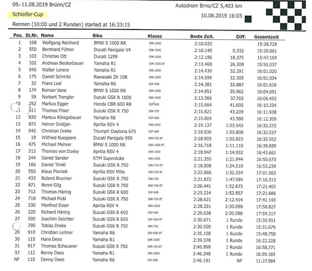 Nach nun zwei weiteren Läufen in Tschechien und einem zusätzlichen Schleifer-Cup Rennen am Samstagnachmittag, konnten sich zwei Piloten bereits frühzeitig Ihren Klassensieg sichern. Wir gratulieren den Piloten Thomas F. / SBK750 und Markus K. / SSP600 zur Cupmeisterschaft 2019. In der SBK1000 bleibt es bis zu den letzten beiden Wertungsläufen in Most noch spannend.