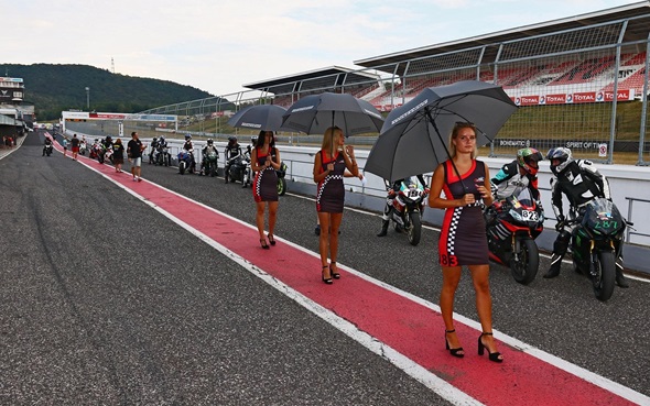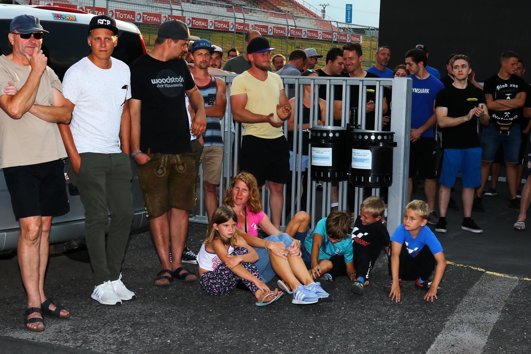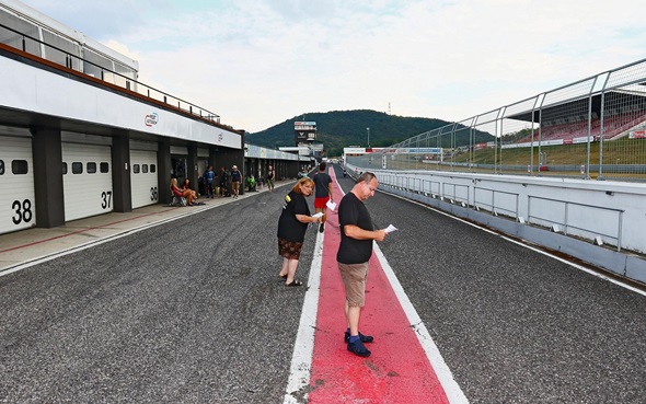 Ab 13.00 Uhr wäre die Rennstrecke wieder für alle Teilnehmer befahrbar gewesen, aber durch einen Wetterumschwung, bzw. ein leichtes Dauernieseln, warteten alle Teilnehmer ab, wie sich das Wetter weiter entwickelt. Da aber der Asphalt durch die hohen Temperaturen der letzten Tage so stark aufgeheizt war, verdunstete der Nieselregen wie Wasser auf einer heißen Ofenplatte und so dauerte es nicht lange, bis einige Unerschrockene die Gripverhältnisse testeten. Nach einiger Zeit kam auch wieder die Sonne durch die dichte Wolkendecke und so wurden es immer mehr Teilnehmer, die sich wieder auf den Track wagten.