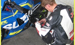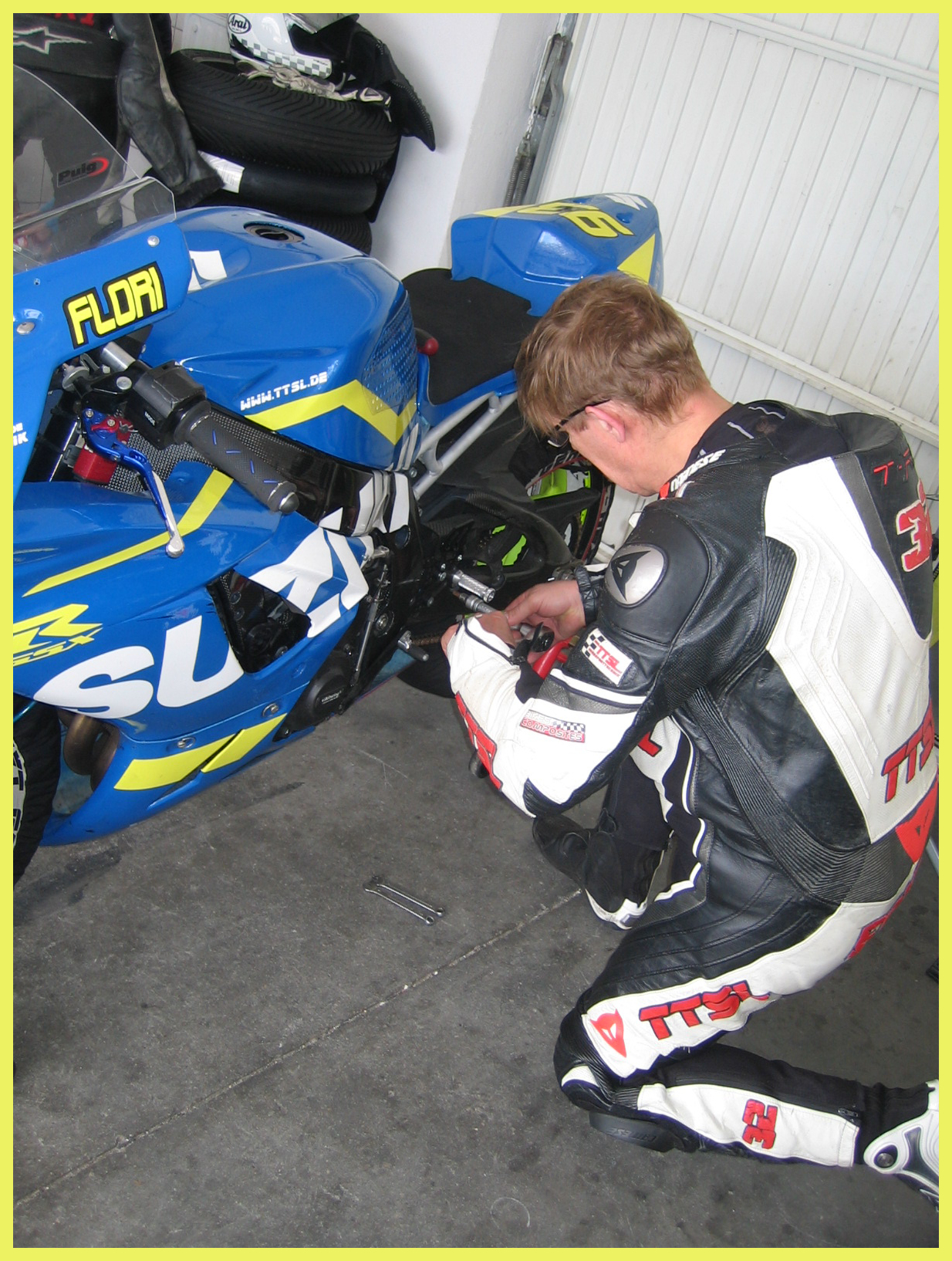 Am Freitag nach der Fahrerbesprechung starteten die Schleifer Ihre ersten Turns bei 23°C. Stefan H. und Bene H. waren als Instruktoren gefragt, bei den Schleifern sowie auch bei den Teilnehmern von FR-Performance. Stefan H. war der fleißigste, der schon bis zur Mittagspause 5 Turns (!!!) fuhr. Franz L. nahm währenddessen Fahrwerkseinstellungen an Florian K.´s 600er SUZUKI GSX-R vor. Die Freude, endlich einmal wieder eine 600er zu pilotieren zu können, stand Franz das ganze Wochenende regelrecht ins Gesicht geschrieben.