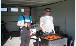 Der Regen ließ nach etwa 2 Stunden nach und die Strecke trocknete nochmal bei leichtem Sonnenschein ab. Einige Schleifer wagten sich noch auf die Strecke um für das Rennen 1 am Samstag Nachmittag eine schnelle Runde zu drehen und eine gute Startposition herauszufahren. Da sich aber auf der Strecke noch einige nasse Stellen befanden, waren Top-Zeiten nicht möglich, aber alle konnten den ersten Tag sturzfrei beenden. Am Abend ließen es sich Stefan und Bene nicht nehmen, wieder für alle Schleifer scharfe Käsewürstchen zu grillen. Mig mischte für alle Beteiligten fleißig Getränke und sorgte so für die benötigten Vitamine für die nächsten beiden Tage.